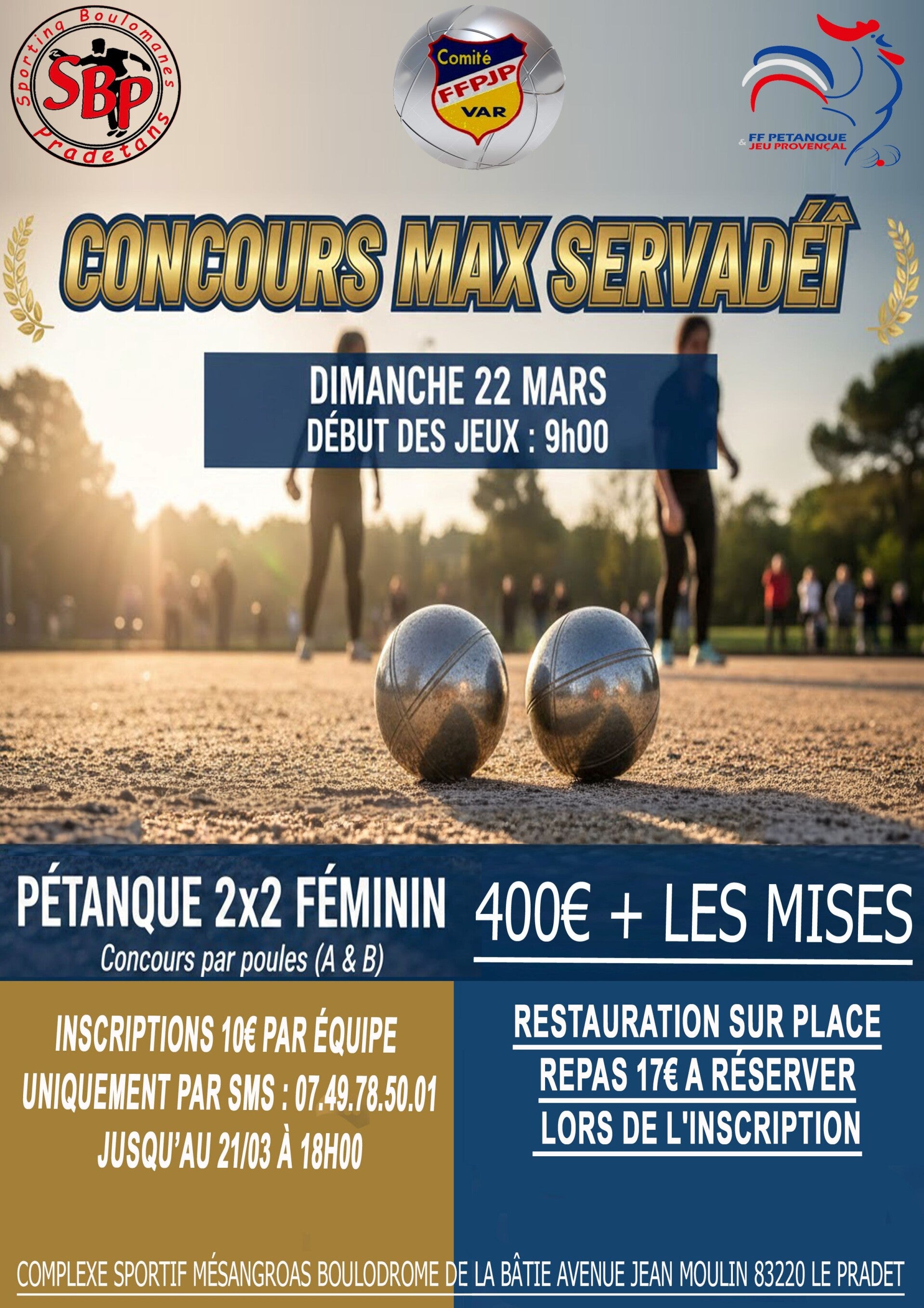 jeudi 03 Septembre 9h00 Provençal 2x2 Vétéran A et B inscription 12€ par équipe Dotation 800€+les mises